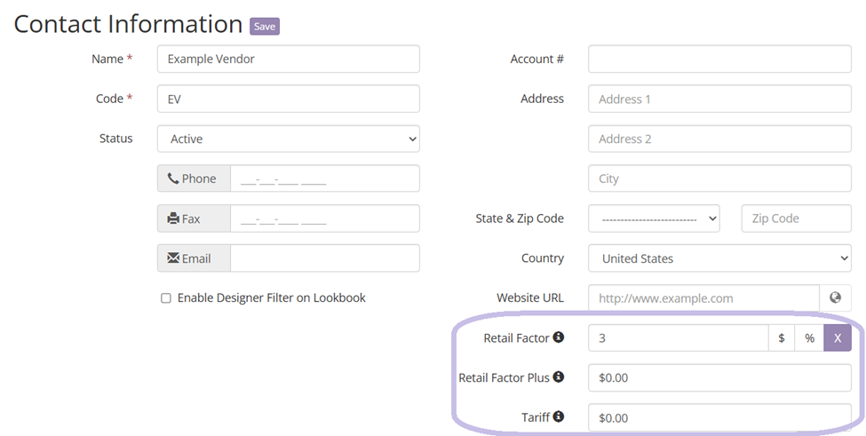 Retail Factors, Retail Factor Plus, and Tariffs can be added to the Vendor’s Information page: